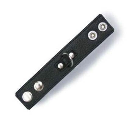 Black leather 1″ wide ball stretcher with a shiny metal D ring.