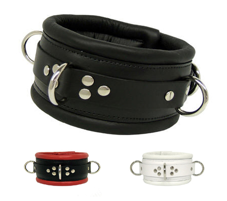 Genuine leather padded BDSM collar with 3 metal D rings. Available in black, black-red and white colours.
