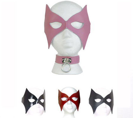 Genuine leather bat mask in pink, black patent, red patent or black leather. Held in place with an elastic strap.