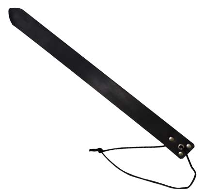 This leather BDSM paddle features a long, slim design crafted from durable black leather for maximum impact and control. Reinforced with metal rivets at the handle, it offers both strength and stability during use. The smooth surface allows for sharp, precise strikes, making it an ideal choice for those who prefer a more intense experience.