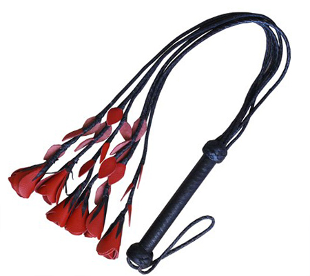 31″ Black and Red Leather Flower Tipped Flogger | 6 flogging tails are braided leather (not cheaper suede) with heavy red and black leather flower tips for more of a “thudding” (rather than stinging) action