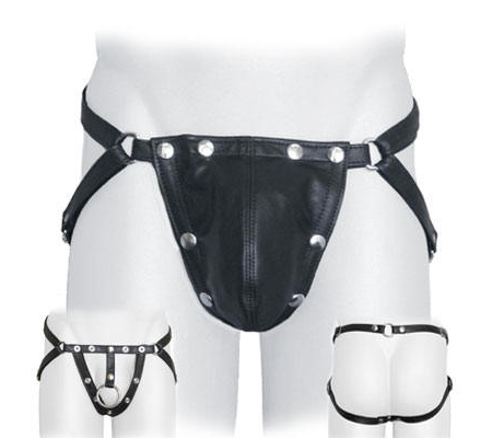 Black leather adjustable cod jock with a cock strap and ring. This cod piece is attached to the jock by snaps. Available in one size only.