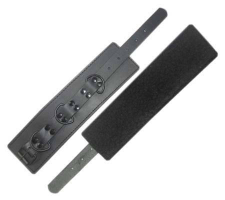 Black leather wrist/ankle bondage restraint cuffs with black fleece lining and black hardware buckle, 2 D-Rings and rivets). Choose from wrist or ankle styles.