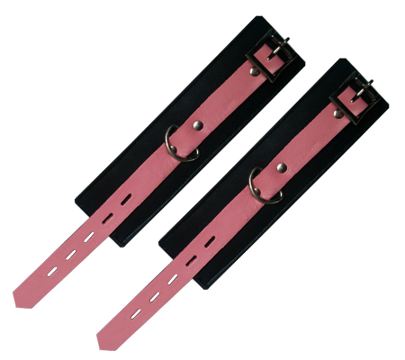 Black/Pink leather wrist or ankle cuffs for bondage are made from genuine leather and are lined with fur like fleece lining. There are also two solid metal D rings on these cuffs which can be used to attach both pairs together. This pair of cuffs also has a locking buckle, meaning, a small padlock can be placed on buckle to secure it in place.