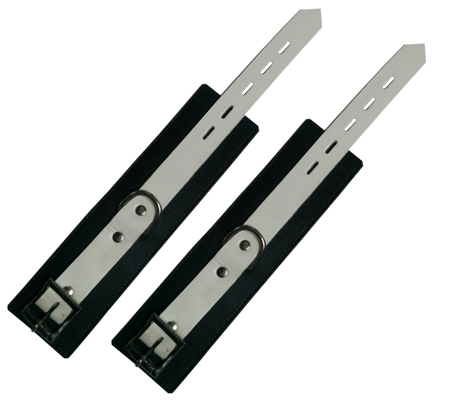 Black/White leather wrist or ankle cuffs for bondage are made from genuine leather and are lined with fur like fleece lining. There are also two solid metal D rings on these cuffs which can be used to attach both pairs together. This pair of cuffs also has a locking buckle, meaning, a small padlock can be placed on buckle to secure it in place.