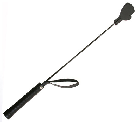 This popular bondage crop features a wide hand shaped leather spanking flap to provide you with more of slap as opposed to a sting. Includes a comfortable leather wrapped handle, flexi shaft and a retaining strap for grip or show.
