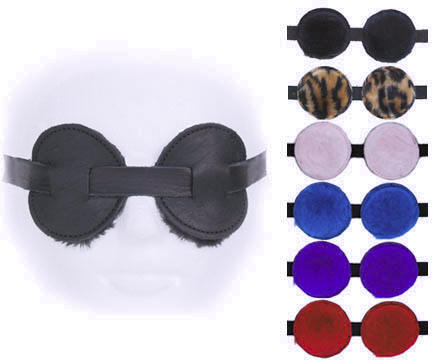 Genuine black leather lennon blindfolds with black, leopard, pink, blue, purple and red fleece lining.