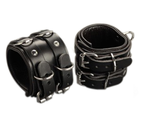 Genuine leather cuffs in black. These cuffs have double buckles and are available in both wrist and ankle styles.