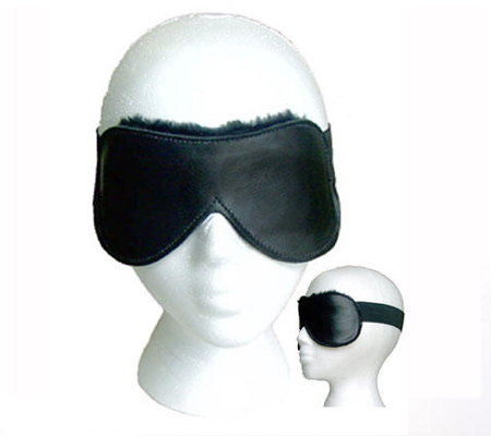 Black leather blindfold with elastic strap and fleece lining.