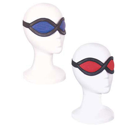 Red or blue leather figure 8 bondage blindfolds. These blindfolds are leather lined and have an elastic strap to hold it in place.