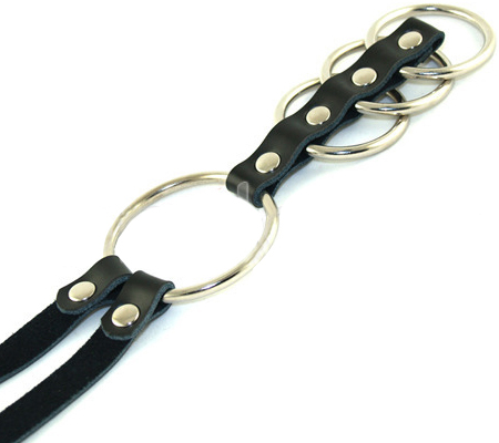 This fantastic Gates Of Hell steel cock ring including three metal cock rings and one ring for behind the scrotum looks and feels the part. It is connected by a leather strap and includes a strap which can be worn around the waist or used as a lead.