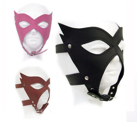 Genuine leather head harness with cat mask. Masterfully crafted, this cat mask is available in pink, red and black leather and one size that fits most.