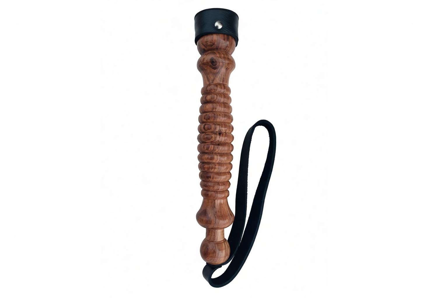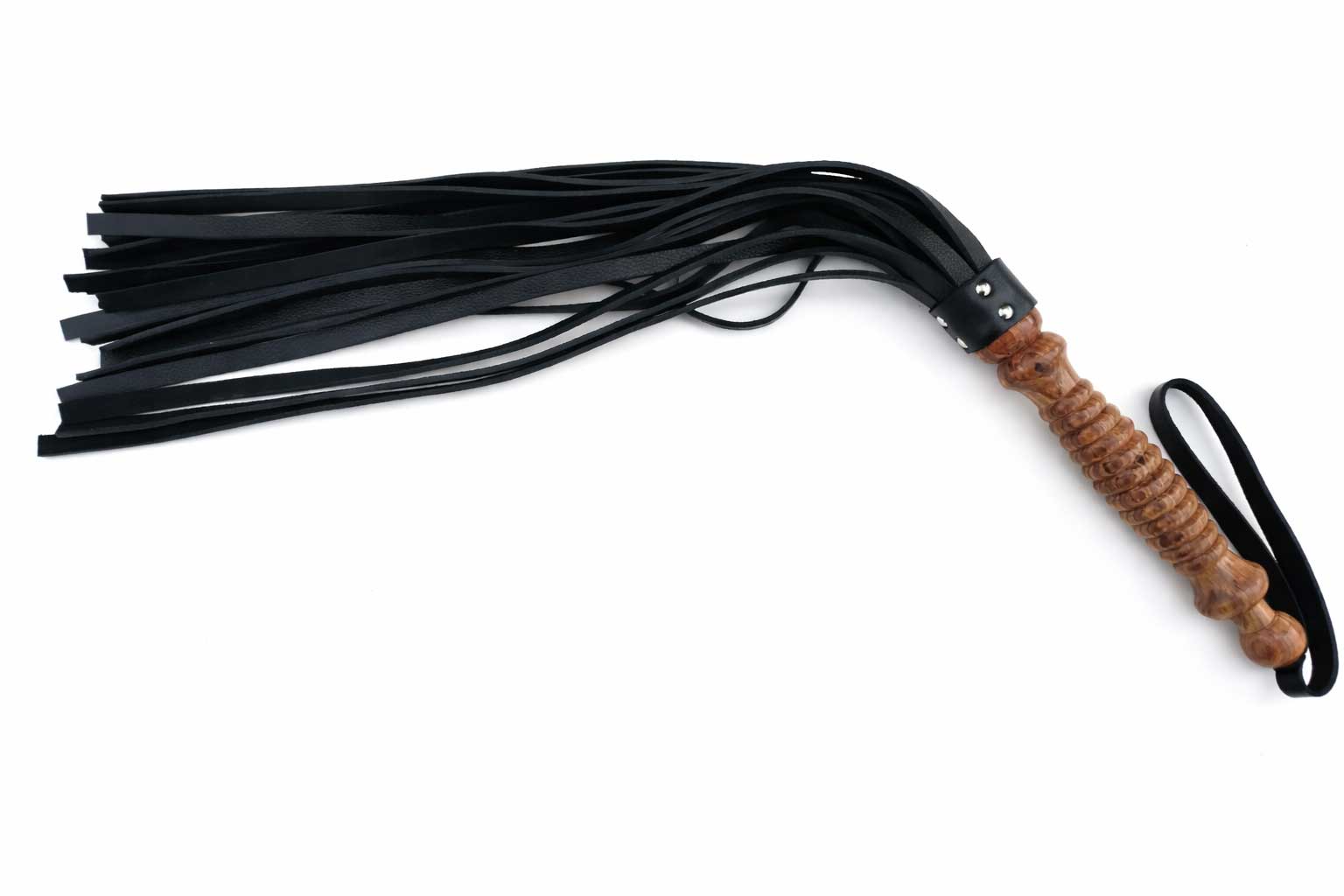 This stylish flogger is crafted with a smooth wooden handle for a secure grip, complemented by a practical wrist loop for added control. The striking black leather falls are cut into multiple wide strands, providing a balance of visual appeal and functionality.