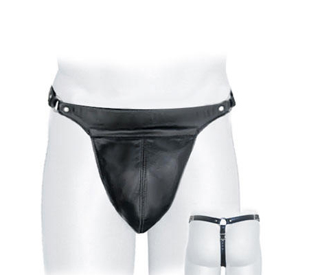 10-Black leather jock with size adjustable waist and back strap. Available in one size that fits most. There is a lot of room for waist size adjustment.