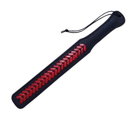 This BDSM leather paddle is crafted with durable, high-quality leather, designed for both style and performance. Featuring a sleek black base accented with a bold red stitched pattern, it offers a striking look while ensuring long-lasting use. The paddle has a sturdy structure that delivers a firm yet controlled impact, making it ideal for both beginners and experienced users.