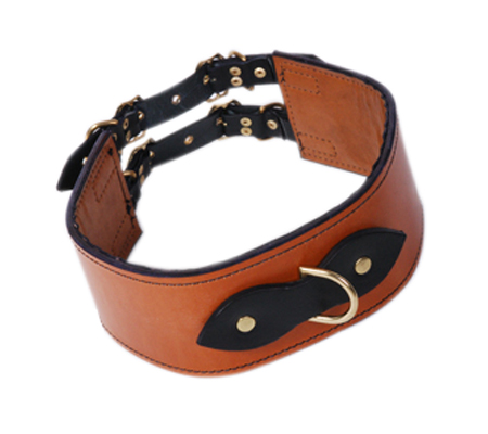 Brown leather collar backed with brown shoulder leather. It comes with a brass d-ring at the front and is fitted with two straps and brass d-rings at the back