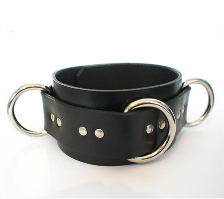This Triple D-ring Leather Bondage Collar is 2″ wide and is fitted with 3 welded 6mm thick Heavy D-rings across the front and sides. The leather bondage collar is made with water buffalo hides which are very strong and extremely thick (9oz). This collar is perfect for attaching different type bondage accessories to for tethering your slave or down-right immobilizing your subject in many different positions. In the back is a 1¼” wide Heavy Roller Buckle and Steel Loop. This triple Dee ring bondage collar is also available in the red-trim leather so please read my Leather Information page regarding my different types of leathers used.