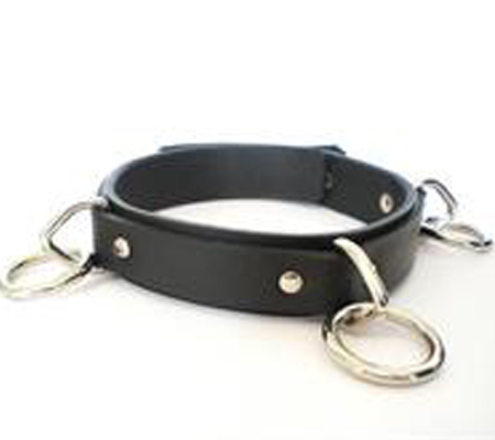 This Leather Bondage Collar is 1¼” wide and is fitted with 3 Extended Bondage rings across the front and sides. The D&O rings are 3/4″ wide and 1″ in diameter (O-ring). This leather collar is very strong with 9mm & 10mm long rivets are used to fix a ¾” wide leather strap that runs the length of the collar to a buckle and eyelets in the back. The leather used is 10oz thick and is beveled on the edges to make a beautiful rounded edge for comfort. A protective beeswax leather conditioner is used on the bondage collar to keep it supple during play