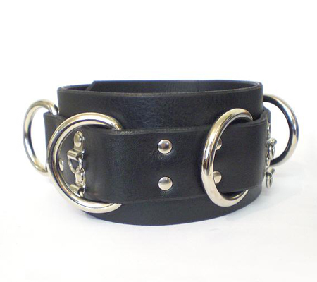 This Extreme Leather Utility Bondage Collar is 2½” wide and is fitted with 4 solid 6mm thick welded Heavy D-rings. The leather used for this bondage collar is water buffalo which is very supple yet extremely strong and hard wearing. The edges of the leather collar are beveled for comfort and beauty. The welded Dee rings are riveted onto the slave Collar using 10mm long rivets with a 1¼” wide leather strap. There is also 2 pairs of D-lugs riveted on the bondage collar for further fetish attachments. In the back of the bondage collar is a 1¼” wide Heavy Roller Buckle. I have many other Bondage Accessories that would be great to use with this collar so check out that page. This bondage collar also comes in red-trim so please check out my leather Information page for more details.