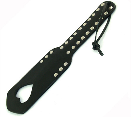 This fantastic and erotic leather paddle whip includes a heart-shaped opening, a retaining strap and studded design. A perfect leather paddle whip for sensual bedroom bondage play.