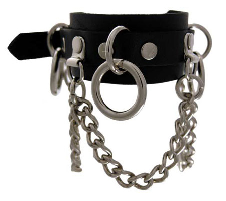Leather Wristband with large chromed bondage rings, a chain and 1.25 inch wide adjustable buckle fastener at 1/2 inch increments.
