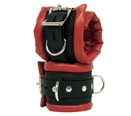 Red and black leather padded restraint cuffs with a locking buckle. Made from genuine leather and great quality hardware, this pair of restraint cuffs offers a cushion like feeling once placed and secured around the wrist or ankles.