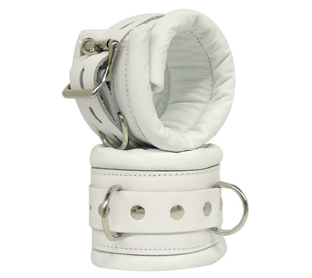 White leather padded restraint cuffs with a locking buckle. Made from genuine leather and great quality hardware, this pair of restraint cuffs offers a cushion like feeling once placed and secured around the wrist or ankles.