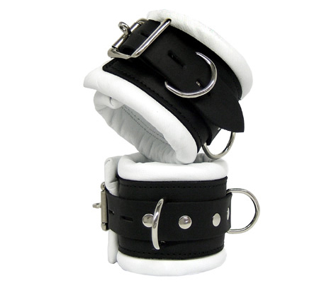 White and black leather padded restraint cuffs with a locking buckle. Made from genuine leather and great quality hardware, this pair of restraint cuffs offers a cushion like feeling once placed and secured around the wrist or ankles.