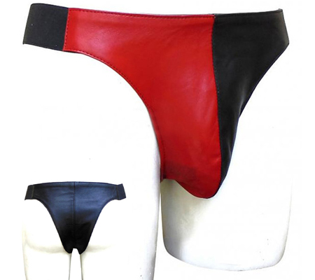 This black perforated leather jock has a wide elastic waist strap and a double strap back. Available in sizes Small/Medium, Medium/Large and Extra Large.