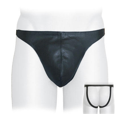 Genuine black leather jock with two elastic straps in the back. Available in sizes Small/Medium, Medium/Large and Extra Large.