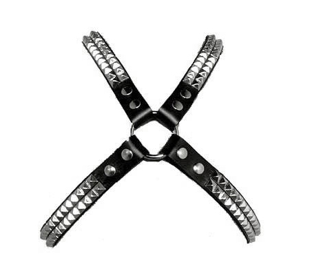 Black leather harness with two rows of shiny pyramid studs on each flap.
