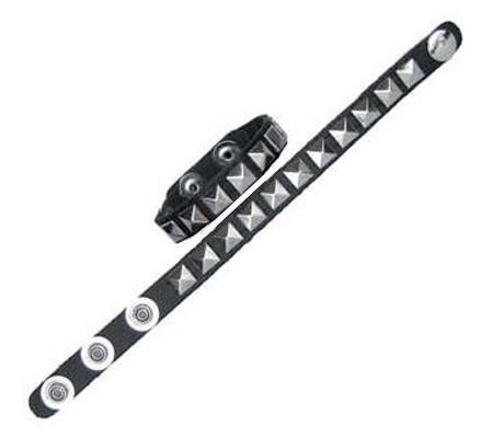 Genuine black leather cock ring with shiny metal rivets placed in a uniform fashion.