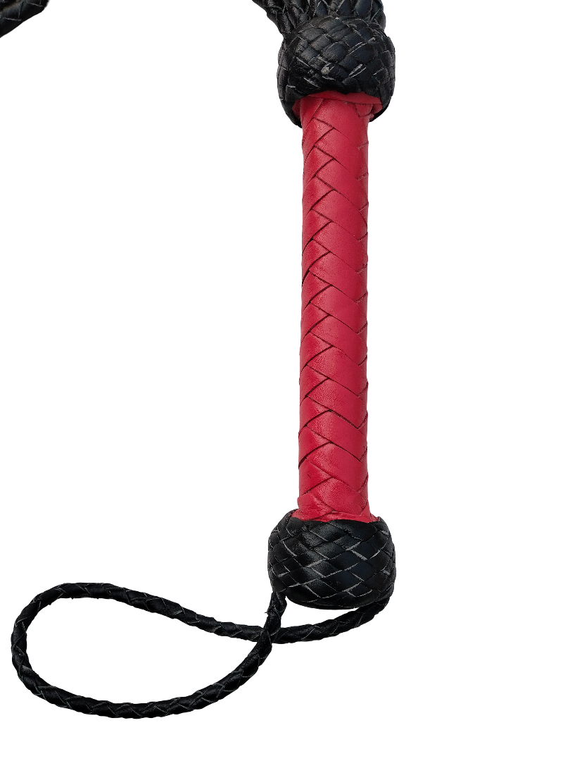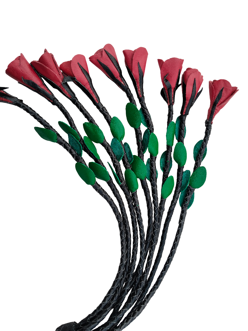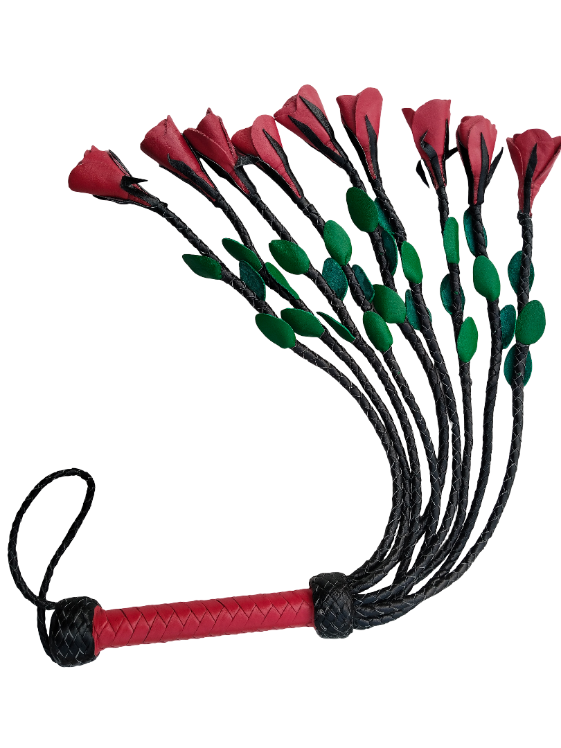 This premium red/black leather flogger is crafted from high-quality cow leather, designed for durability, balance, and refined appearance. It features a solid wooden handle wrapped in rich red leather black falls with green leaf’s and red roses closing tails, providing a comfortable grip and enhanced control during use.