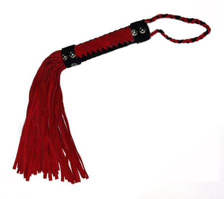 A fabulous handmade suede flogger in red and black with display loop, braided handle and 50 perfect whipping tails. This high quality suede flogger will please.