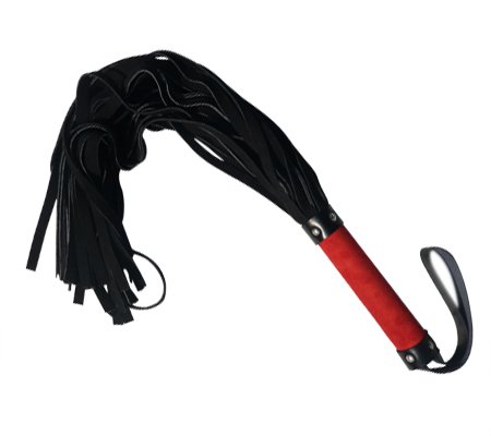 A fabulous handmade suede flogger with suede red handle and suede black whipping tails. This high quality suede flogger will please.