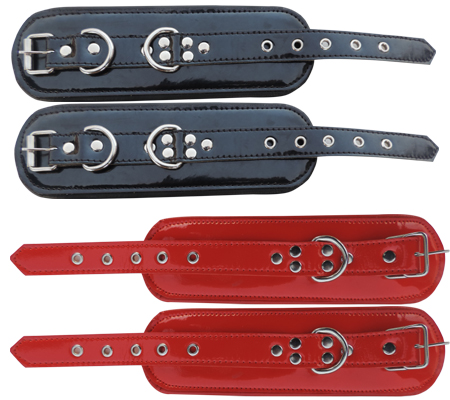Shiny Leather Lined Restraints: Red patent leather cuffs with red leather lining or black patent cuffs with black leather lining. Available in both wrist and ankle styles.
