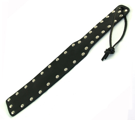 This fantastic and erotic leather paddle whip includes a heart-shaped opening, a retaining strap and studded design. A perfect leather paddle whip for sensual bedroom bondage play.