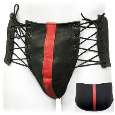 Leather thong shorts with laces in the front and lycra back. Available in sizes Small, Medium, Large, Extra Large and 2XLarge.