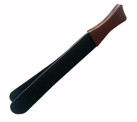 Here is a new addition to our Paddle and Spanker collection. It has a round handle wrapped in soft leather… very comfortable to hold. It makes a nice loud crack and delivers a good sting. This piece is hand crafted from top quality 12 oz harness leather… That’s heavy leather, about 3/16in thick. This leather is vegetable tanned and has a beautiful natural full grain and a very nice feel. This is tough, rugged leather that will stand up to many years of hard core BDSM play. All edges are beveled, burnished and treated with our custom formulated leather conditioner. The loop is made from 10oz harness leather and tied with a True Lover’s Knot.