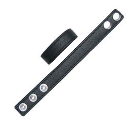 Black leather cock ring with three shiny metal snaps to hold it in place.